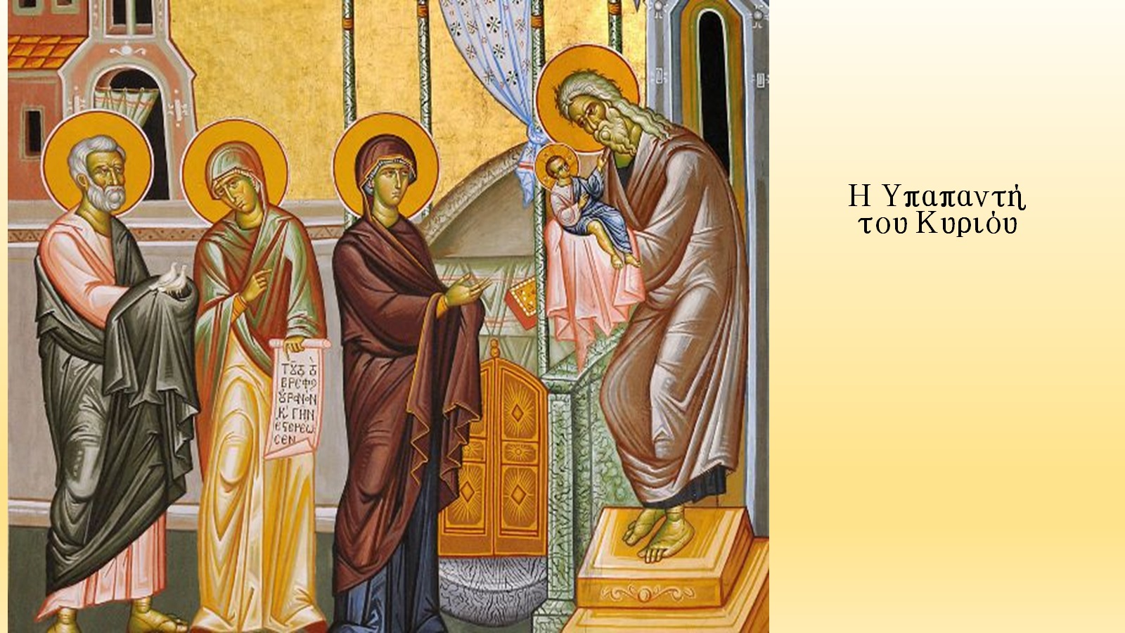 Μικρή προβολή με μερικά βασικά στοιχεία για την εορτή της Υπαπαντής. Κατάλληλη για χρήση ταυτόχρονα με αντίστοιχο θέμα για παιδιά Δημοτικού.