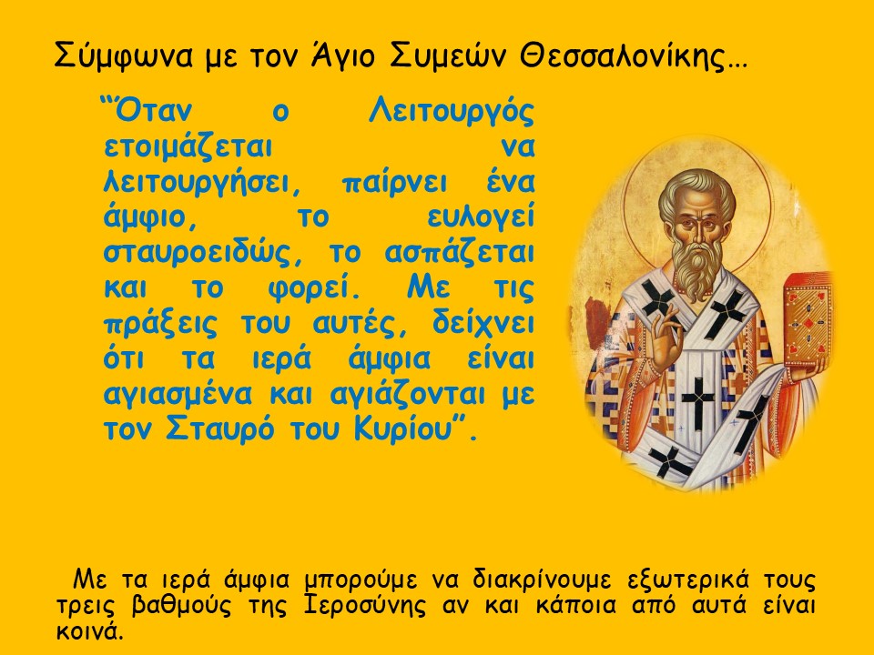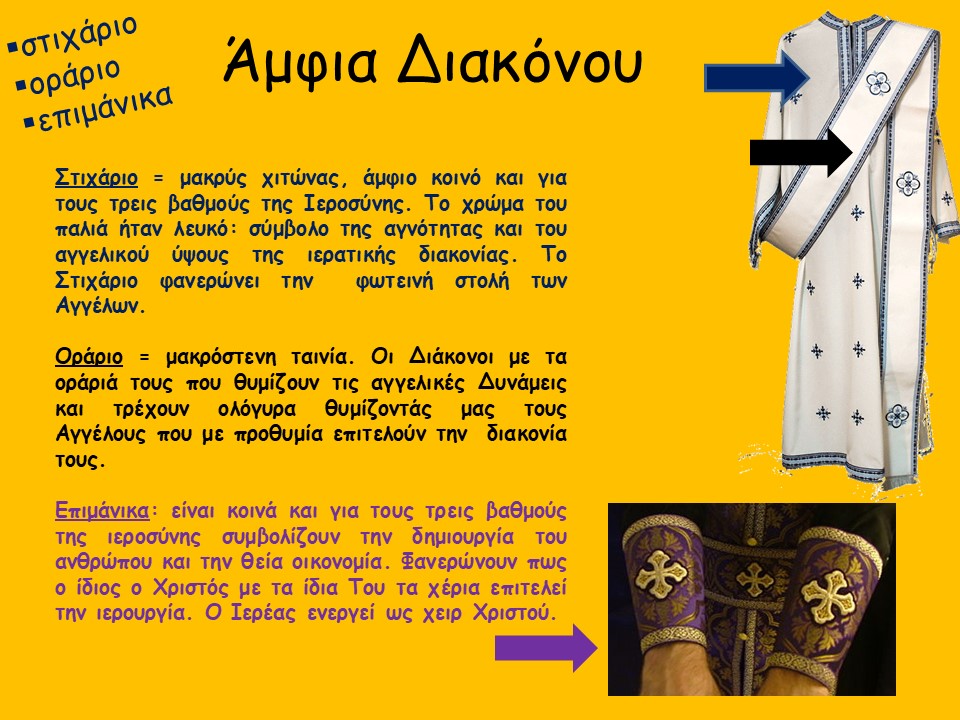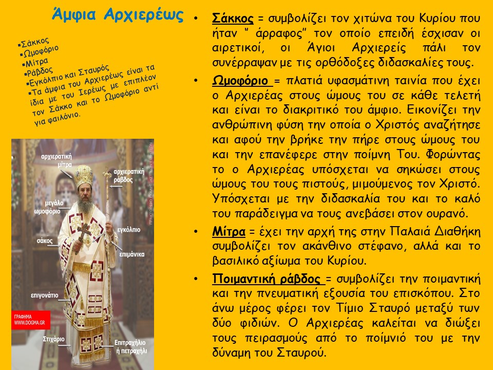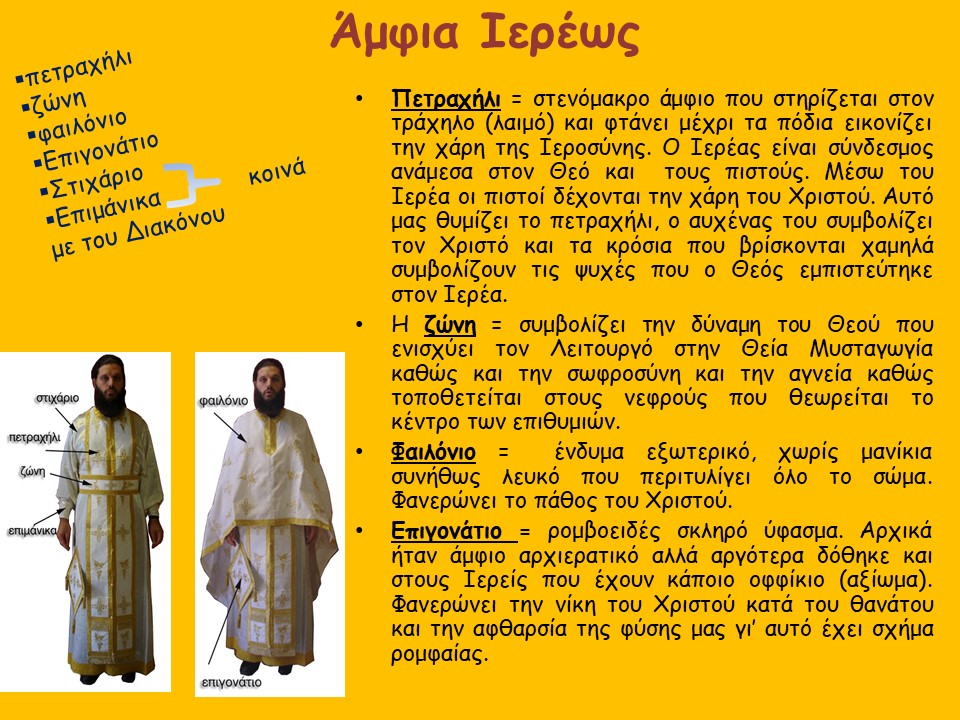 Μικρή προβολή-παρουσίαση διαφανειών σχετικά με τα Ιερά Άμφια των τριών βαθμών ιεροσύνης με σχετικές εικόνες και επεξηγήσεις.