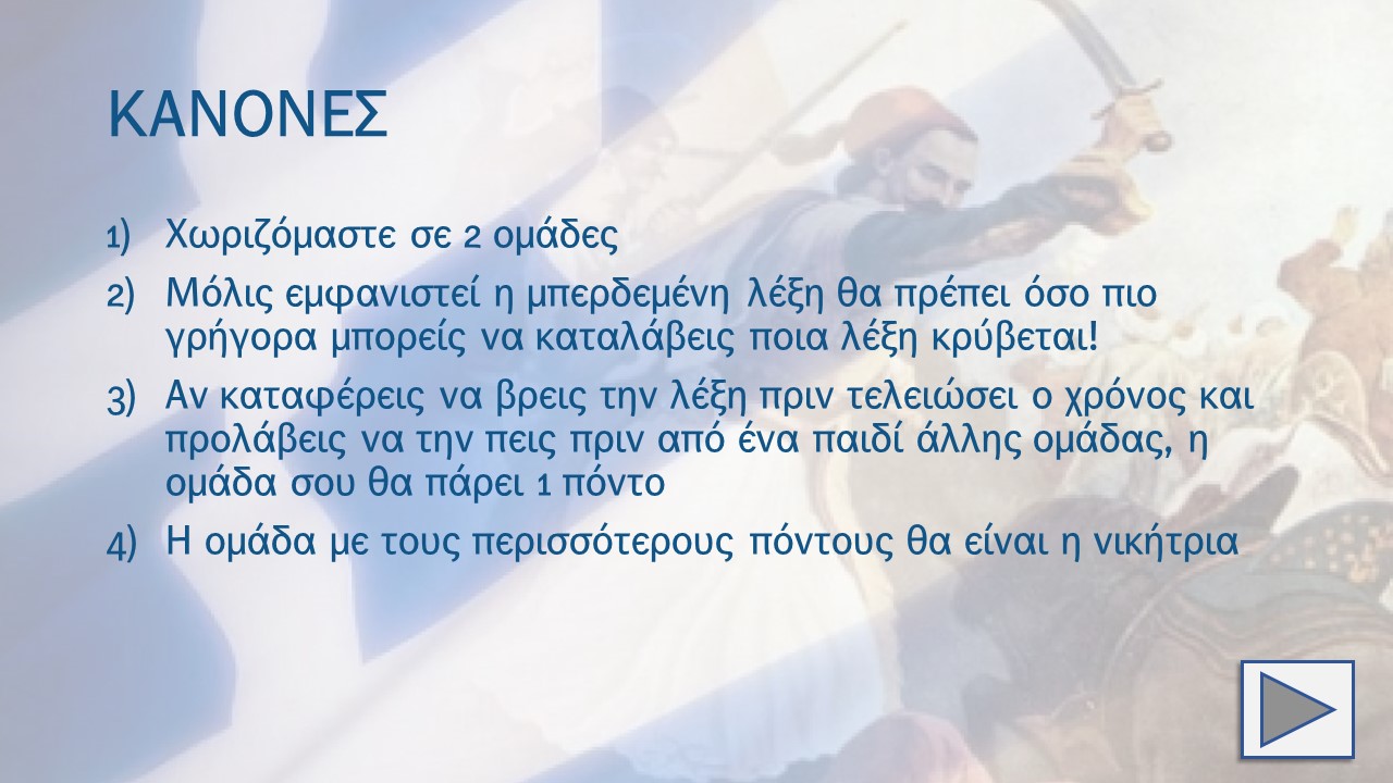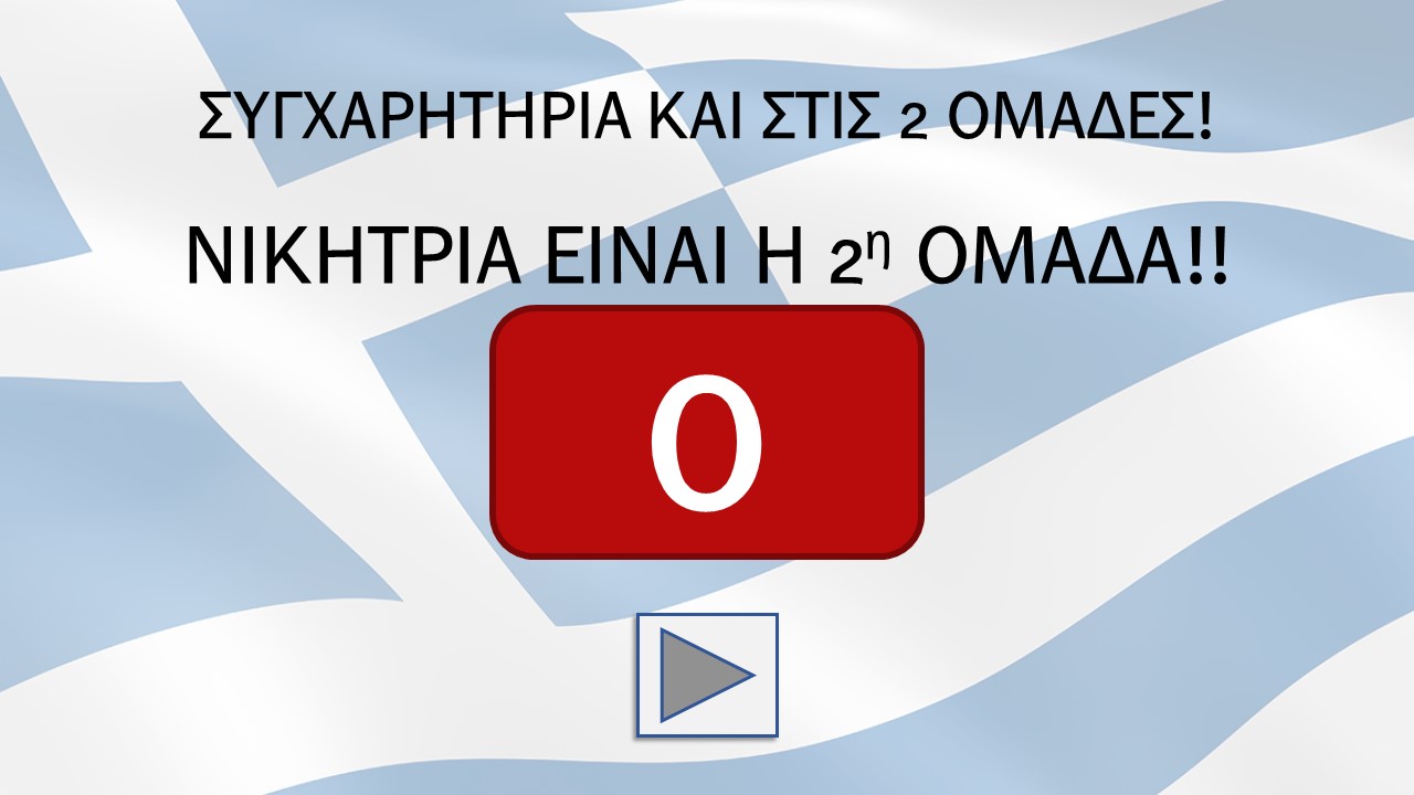 9. Αν η ομάδα δεν βρήκε την λέξη τότε δεν παίρνει πόντο και συνεχίζουμε με την επόμενη διαφάνεια (η οποία θα είναι ερώτηση) και θα απευθύνεται στην άλλη ομάδα.