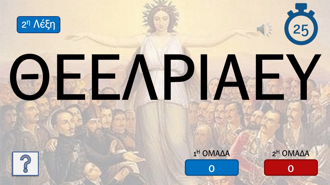 7. Μόλις τελειώσει ο χρόνος θα πρέπει ο ομαδάρχης να πατήσει το κουμπί με το ερωτηματικό για να προχωρήσει στην επόμενη διαφάνεια όπου θα βρίσκεται η απάντηση δηλαδή η σωστά γραμμένη λέξη.