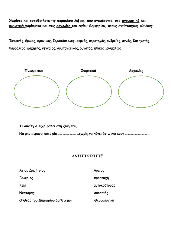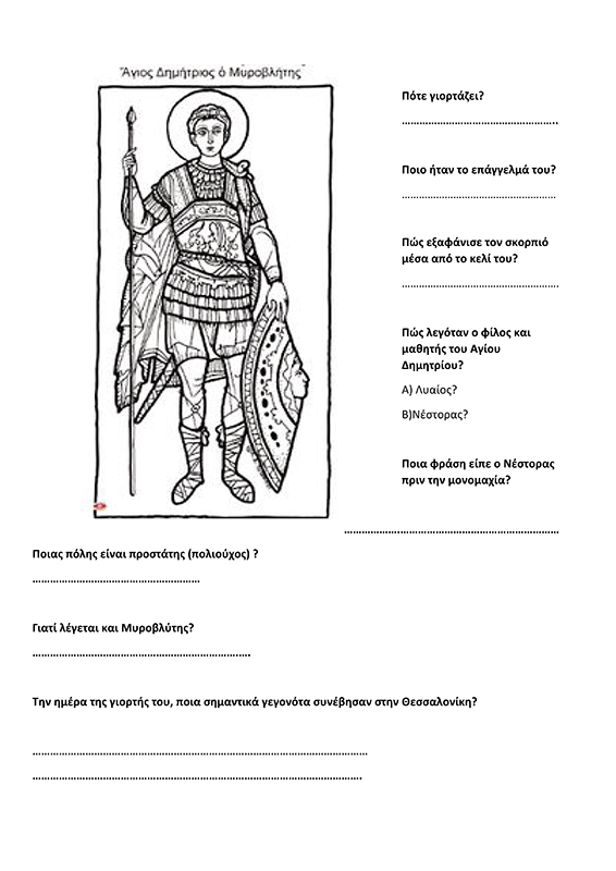 Ένα έτοιμο φύλλο με κουίζ σχετικά με τον άγιο Δημήτριο. Είναι ιδανικό για να πλαισιώσει σχετικό θέμα σε παιδιά Δημοτικού.