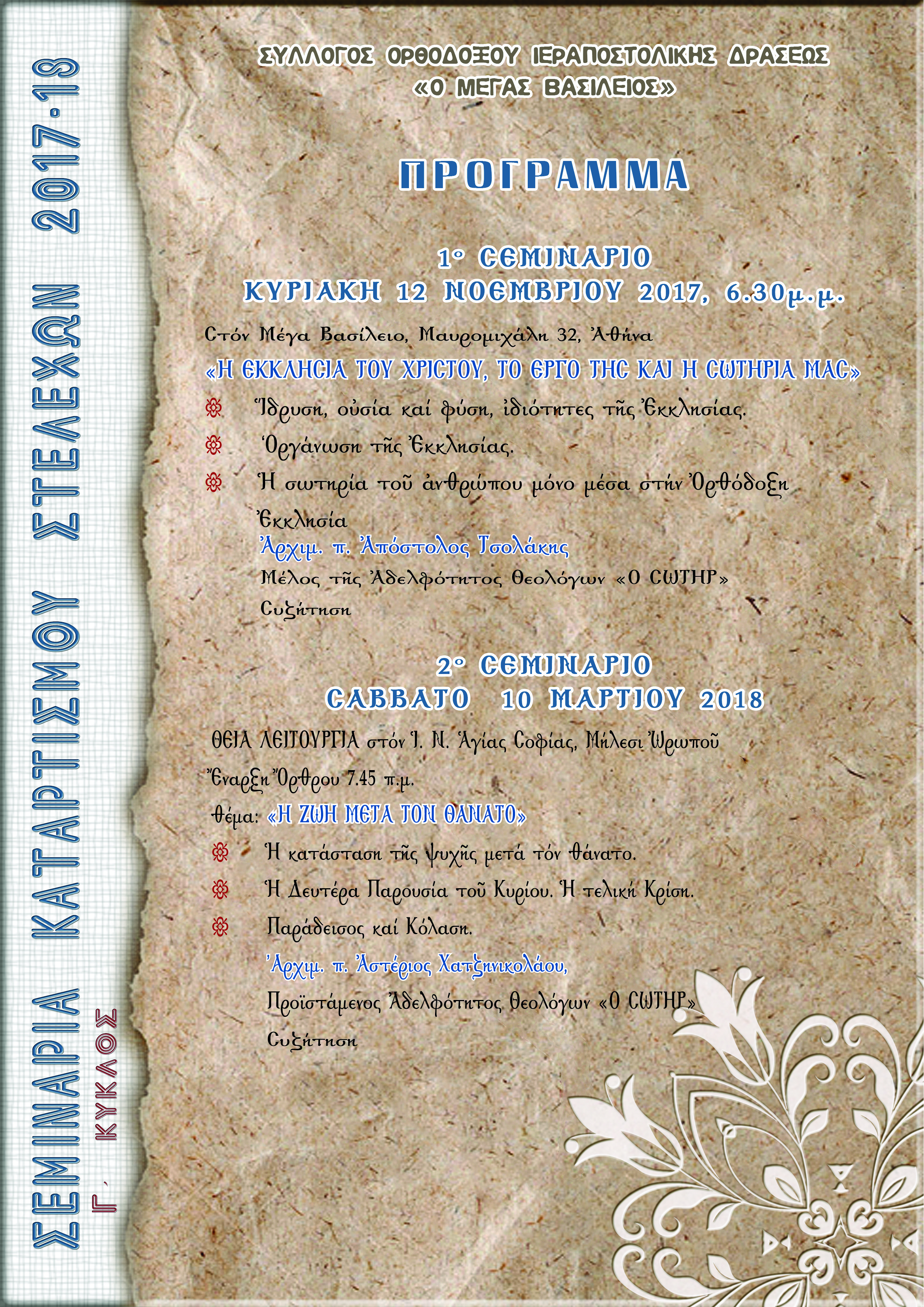 Ο τομέας των Χαρούμενων Αγωνιστριών Αθηνών διοργανώνει τον τρίτο κύκλο σεμιναρίων καταρτισμού με θέματα ορθοδόξου δογματικής (Νοέμβριος 2017 – Μάρτιος 2018).Στα σεμινάρια μπορούν να δηλώσουν συμμετοχή στελέχη όλων των βαθμίδων από τον τομέα των Χαρούμενων Αγωνιστριών καθώς και κατηχήτριες, από την Αττική και άλλες επαρχιακές πόλεις.