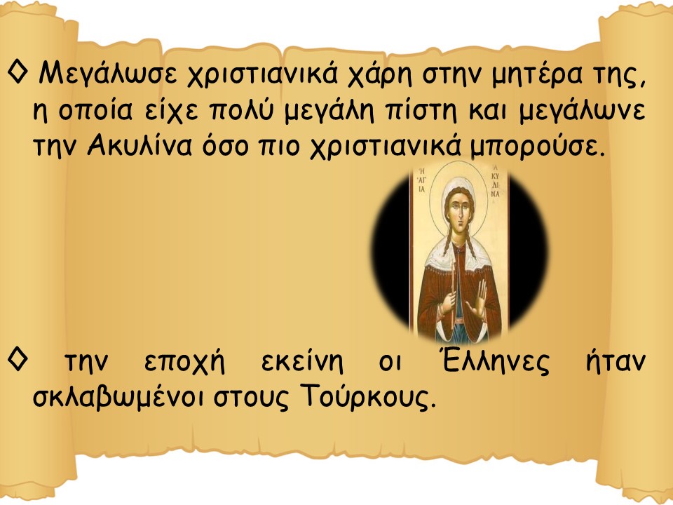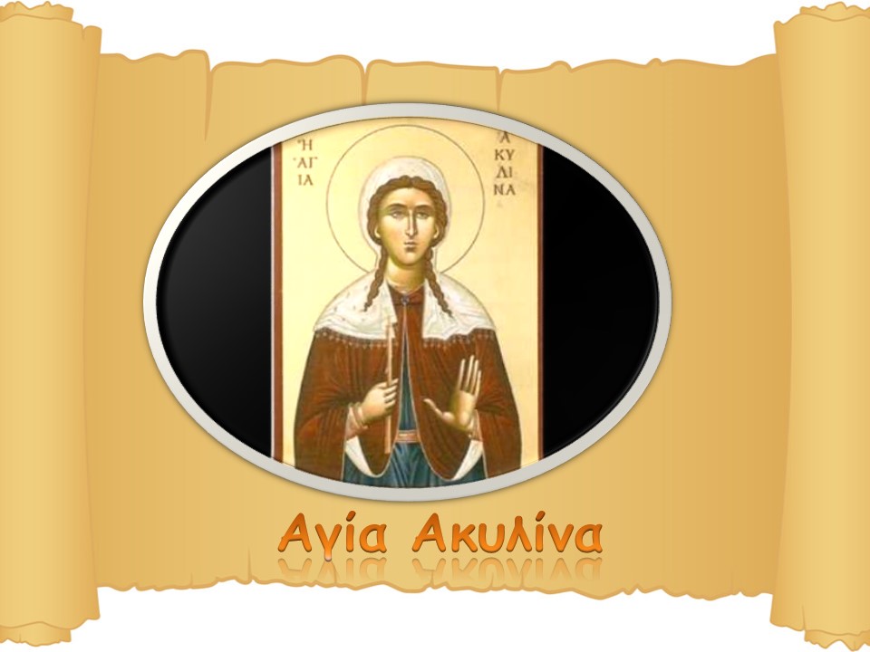Μικρή προβολή διαφανειών σχετικά με τον βίο της αγίας Ακυλίνας της Νεομάρτυρος. Η προβολή είναι κατάλληλη για παιδιά Δημοτικού.