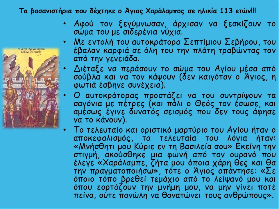 Σύντομη προβολή διαφανειών, που παρουσιάζει τον βίο του αγίου Χαραλάμπους. Κατάλληλη για παιδιά Δημοτικού.